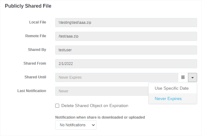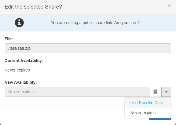 Editing existing share dates has also been updated to include the selection dropdown. You can change a share’s expiration date to/from Never expires/Max Date as shown in the ‘Editing a Share’ screenshot.