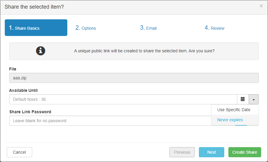 On the Share Wizard tab 1. Share Basics, the Available Until date field has been updated to include a dropdown on the far right. Clicking on the dropdown shows two options depending on parameters set by the Administrator in User Manager / Public Shares. When there is no Maximum Share Duration, the options are Use Specific Date and Never expires as shown below in the ‘Share Wizard with no Admin Maximum Share Duration’ screenshot.