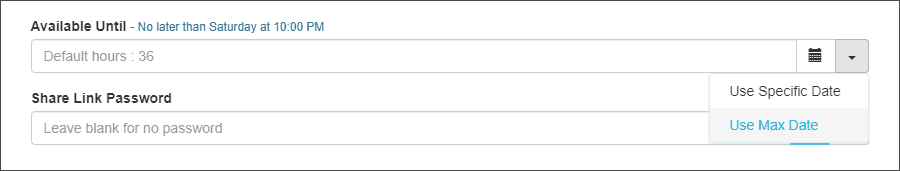 When the Administrator has set a Maximum Share Duration, the options are Use Specific Date and Use Max Date as shown below in the ‘Share Wizard with an Admin Maximum Share Duration’ screenshot. Selecting Use Max Date will set the date and time to the maximum value allowed by the Administrator at the time the share is actually created; while in the Wizard, the date field will show an “estimated” expiration.