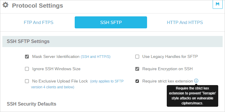 In 2024.1 and later, Server Manager : Protocols : SSH/SFTP has a new option to “Require strict kex extension”. This will be enabled by default as shown in the screenshot below.