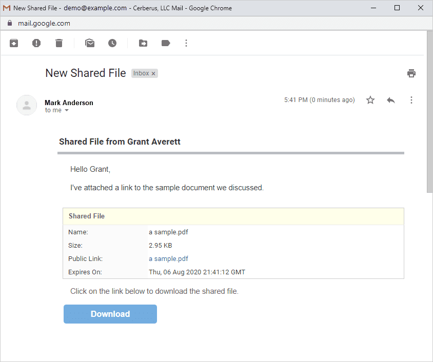 When a user emails a public file link, the recipient will receive an email with your user’s message and a public, unique link to the file or folder. Recipients will be directed to an intuitive web client powered by Cerberus FTP Server where they can download the shared files. Cerberus will log all access through the file’s public link.