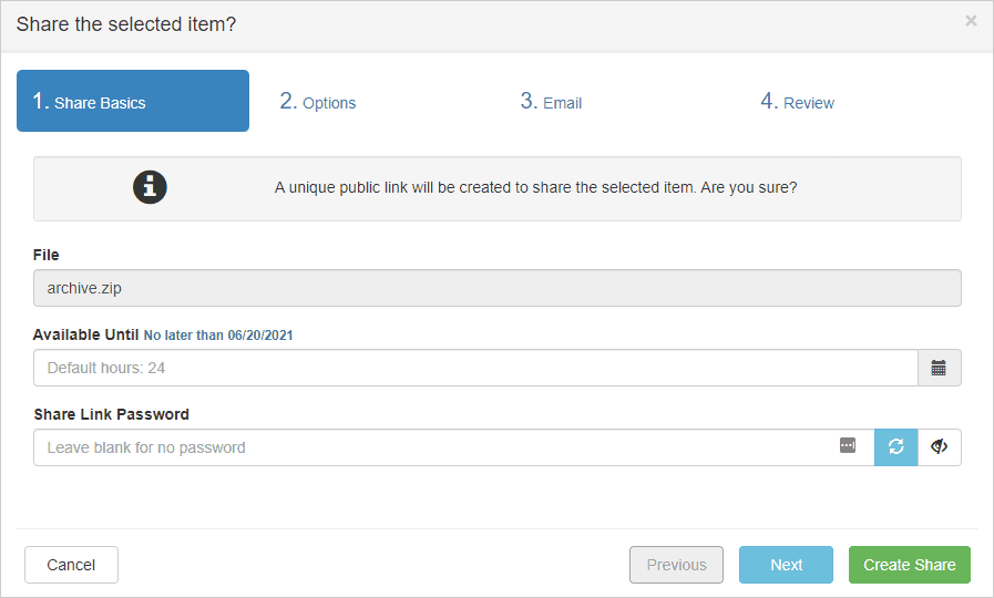 You have full control over public file sharing. Before a user can share a file or folder publicly, the administrator has to grant explicit sharing priviledges to that user’s virtual folder. Once granted permission, users can share files or entire folders that expire within specified timeframes (or stay permanently available).
