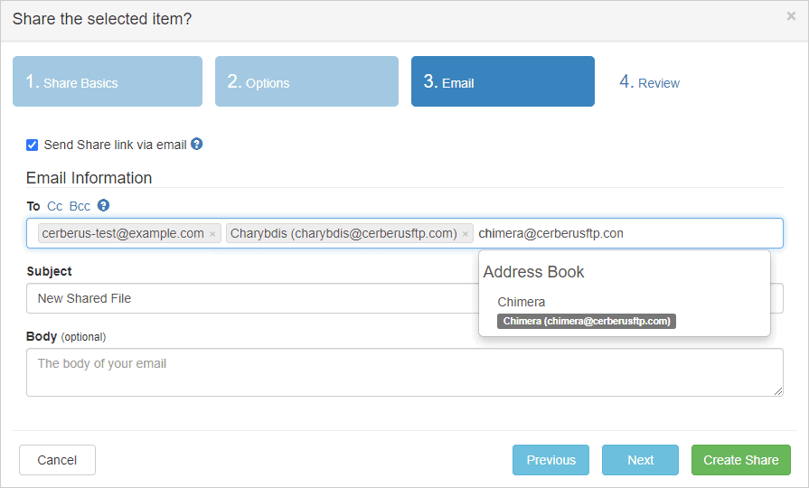 In addition to public file sharing, users can also email a link to a public share directly from within the Cerberus FTP Server web client. Users just need to click the “Email” button on a file to open a dialog for emailing the file.